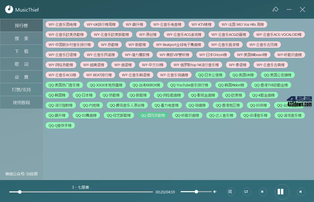 本站提供的盗用音乐平台接口的第三音乐下载工具(MusicThief),仅供个人使用,严禁商业或非法用途,否则因牵涉到音乐版权导致的责任,理因由软件开发者和违规使用者承担,本站特此说明!